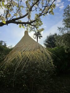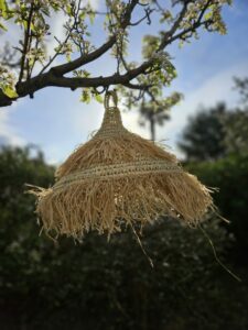 Lampe à poser tressée entièrement à la main avec du Raphia sur une armature en fer forgé. Son tressage resserré permet une lumière tamisée et chaleureuse.