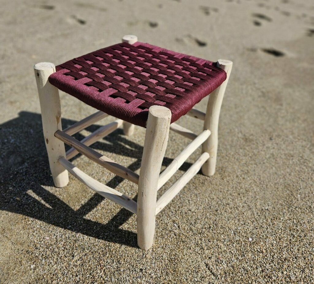 Tabouret en bois massif d’eucalyptus résistant et très solide. L’assise est très confortable, elle se compose de fibre de cactus mélangée à du fil de Nylon appelée la soie végétale.